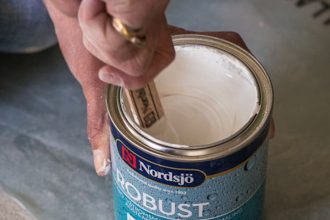 Jag har målat taket i badrummet med Nordsjö Robust våtrumsfärg.
